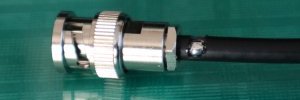 BNCコネクターの取付口付近の同軸ケーブルの外皮を5o各程度むいて予備はんだする