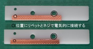 基台の裏側になる面にザグリを入れてM3のリベットを挿入した時及びサラの木ネジでコマを固定した時に裏面が平に