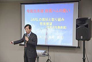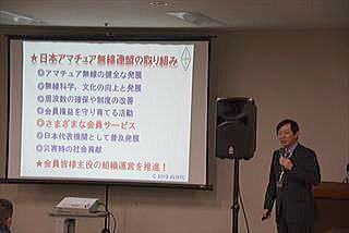 ミニライブ終了後JARL髙尾会長が「JARLの現状と今後の取り組みと将来展望」と題して講演を行いました。講演は、会長になってからの取り組みや課題、今後の方針、2020オリ・パラ記念局等について説明していただきました。