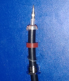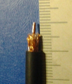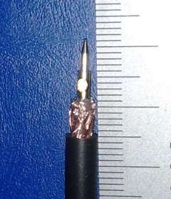 同軸ケーブルの網線・芯線共に5mmの寸法で被覆を剥き芯線にコネクターのピンのはんだ供給