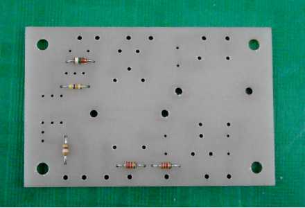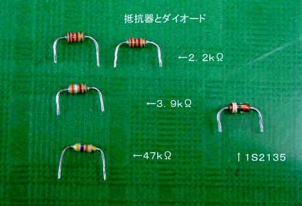 先ず抵抗器・ガラスダイオードなどの背の低い部品を実装し、パターンに沿って折り曲げ適当な寸法でカットする。