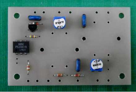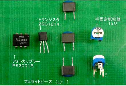 次にフォトカップラー・トランジスター・フェライトビーズ・半固定抵抗器1kΩを実装し、上記の様にリードを折り曲げカットする。
