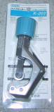銅パイプをバケツのちょうど良い場所で直径27cmのきれいな丸になるように折り曲げ切断します。このとき下の写真のようなパイプカッターがあると便利です。先端を15o程度ペンチで潰して、バリコンの取り付け穴、円の中心にBNC−Jの取り付け穴(2箇所)を3.5ミリのドリルで穴あけします。