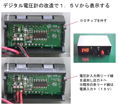 はんだ付けに自信のある方は以下の改造(2線式から3線式に変更)で電圧計の下限電圧を下げることが出来ます。